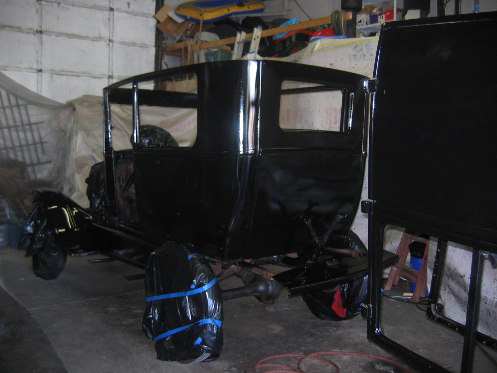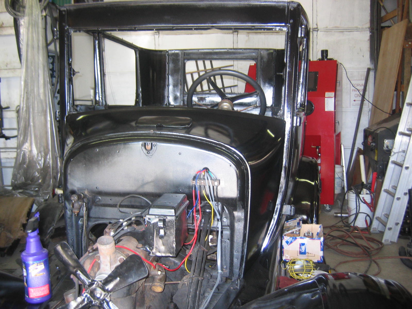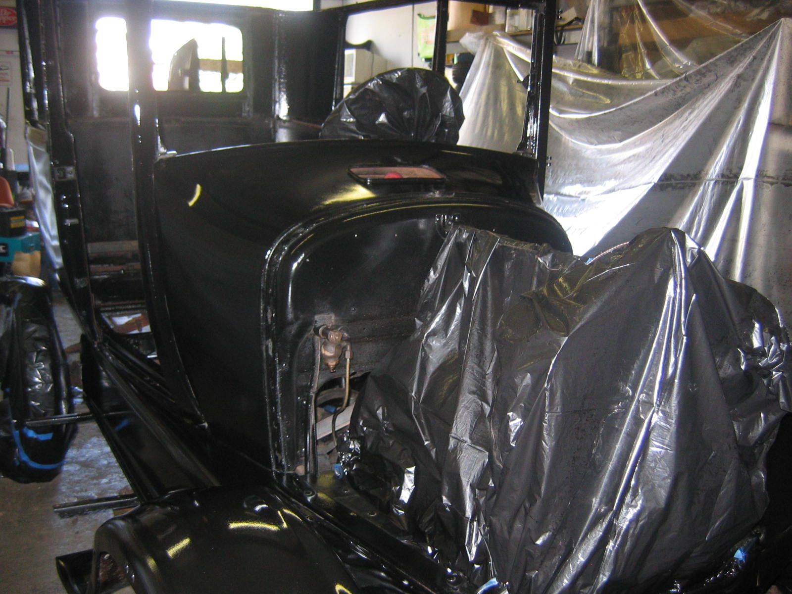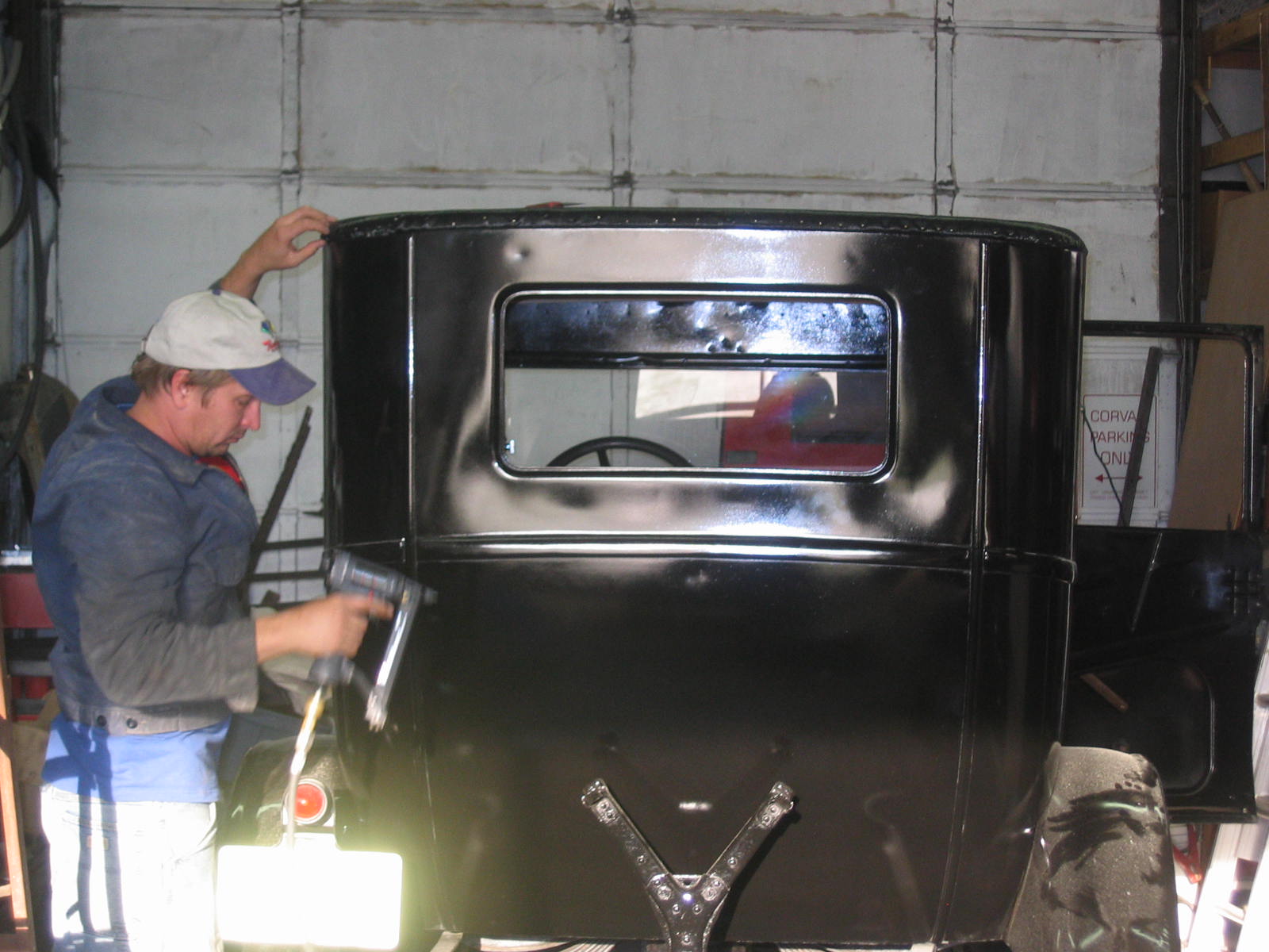 Its not perfect but did Mr. Ford have it perfect? I don't think so... he used a hose to apply paint, we used a spray gun. The paint used was implement- or tractor paint. Who's going to know except us? Black is black is black. Thanks to Kevin and Dana Olson for always helping out! We love you guys.